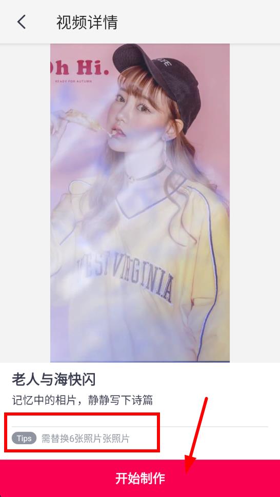 3、进入所选视频模板的详情页,了解如需替换6张照片等要求后,点击开始制作按钮,按提示操作即可拍摄制作趣动视频。