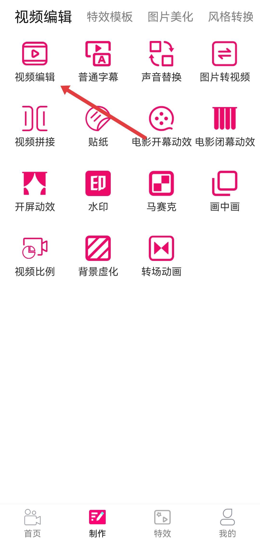 2、在功能选择页面,点击视频编辑分类下的视频编辑选项,进入视频选择界面。