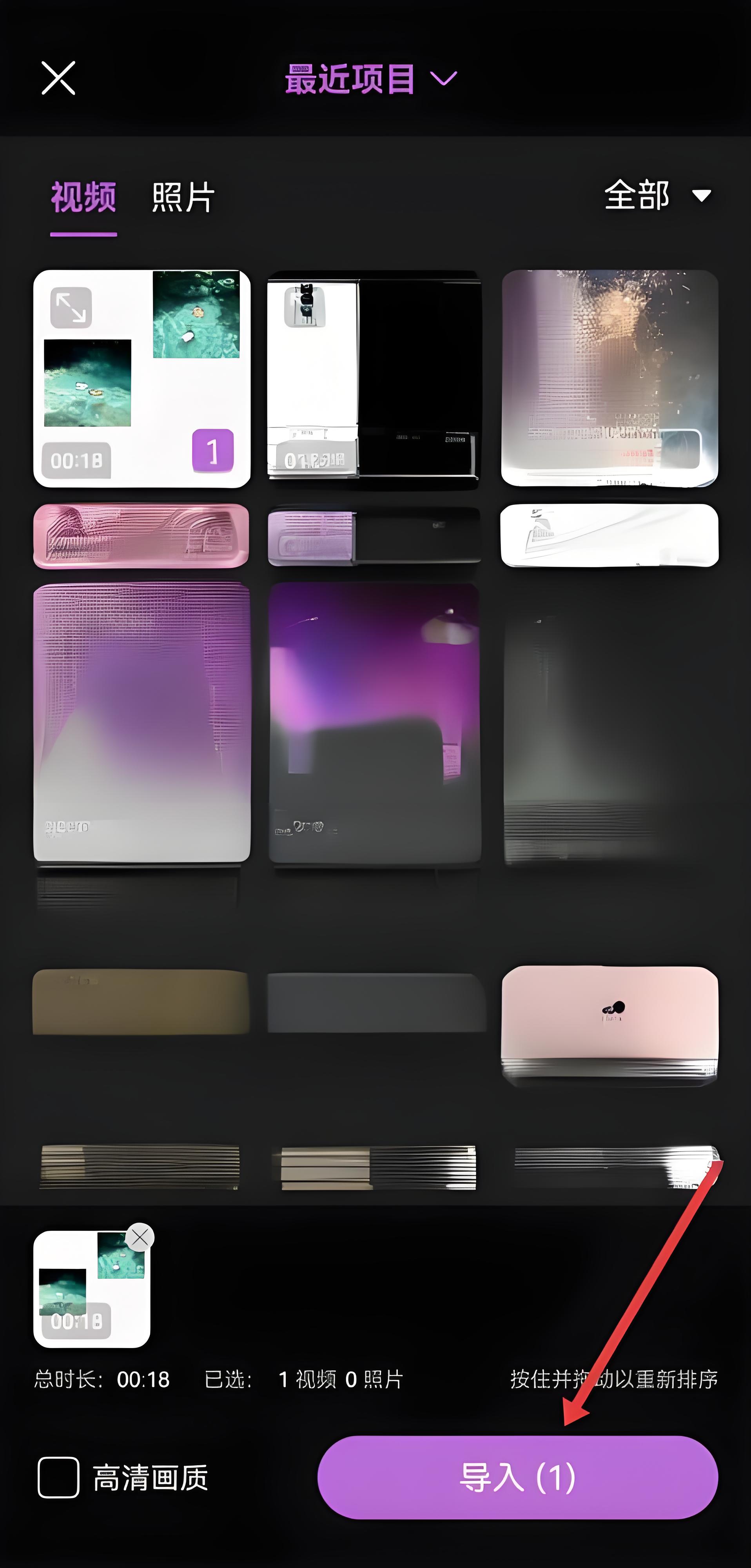 3、在视频选择界面,勾选要编辑的视频后,点击底部导入按钮,进入视频编辑界面。