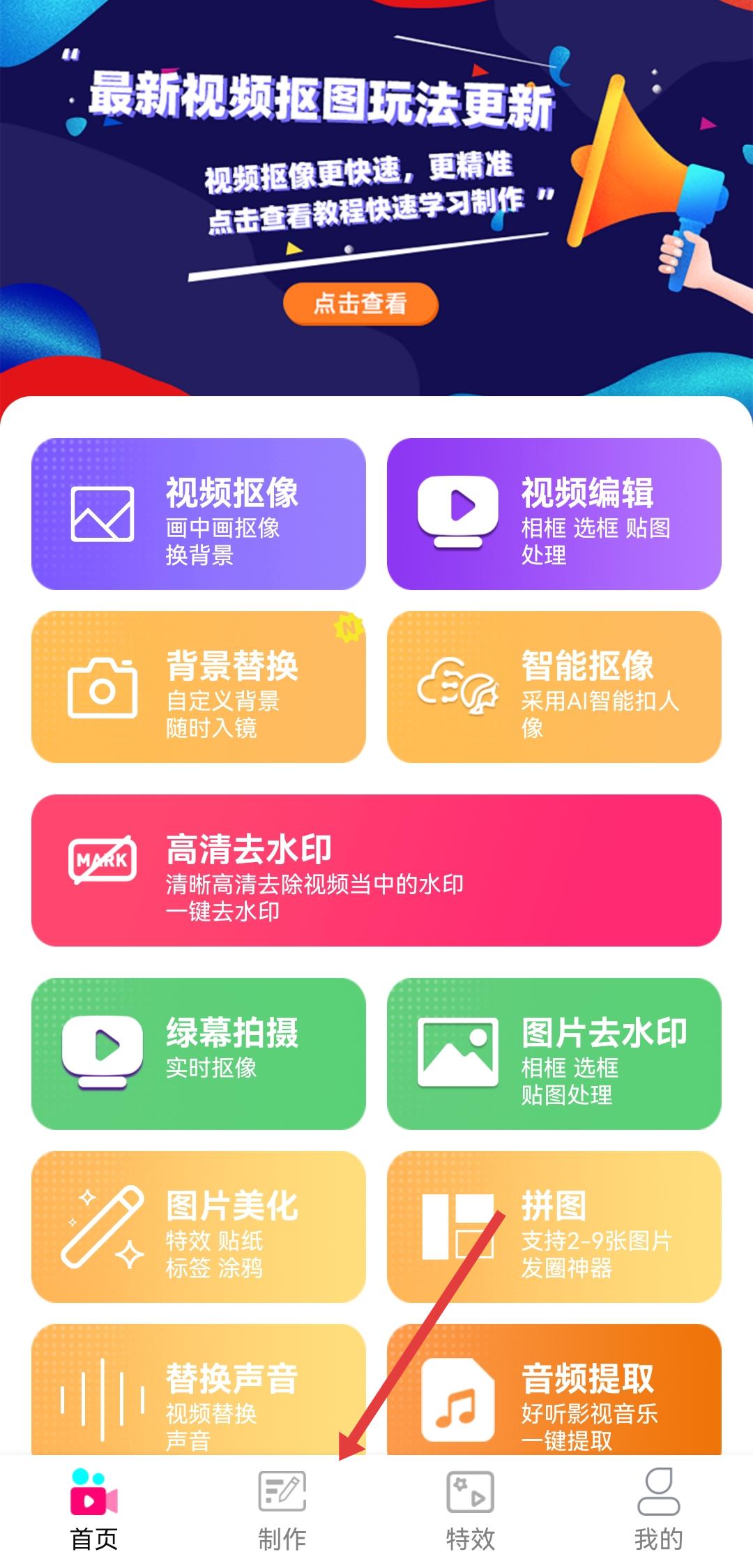 1、在视频抠图app首页底部导航栏,点击制作进入制作功能选择页面。
