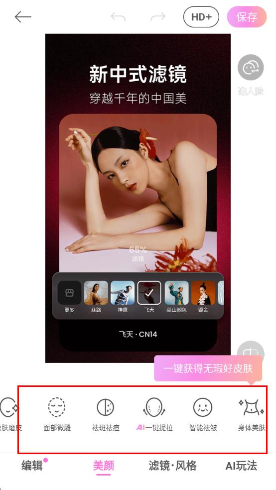 3. 在编辑页,切换到美颜 tab,利用皮肤磨皮面部微雕等工具调整人像;也可结合滤镜·风格等模块,添加滤镜、优化画面。
