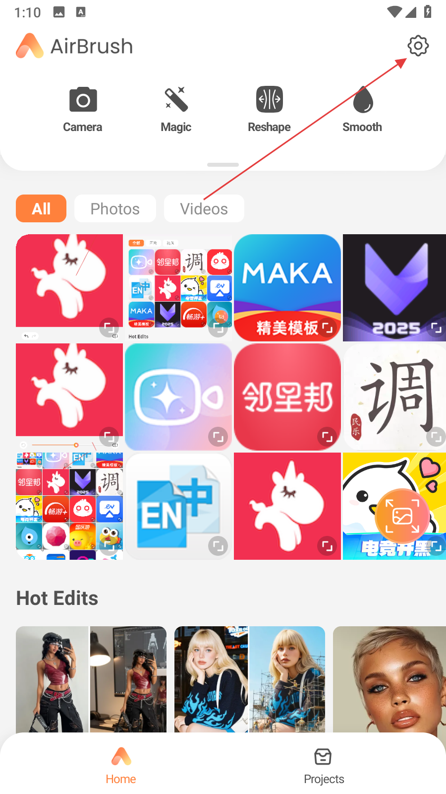 1、打开AirBrush软件,点击页面右上角的设置图标,进入设置界面。