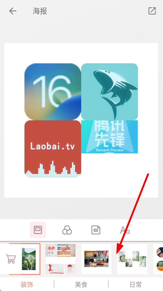 3、在海报编辑界面,下方有装饰、美食、日常等分类,点击选择喜欢的海报风格模板。