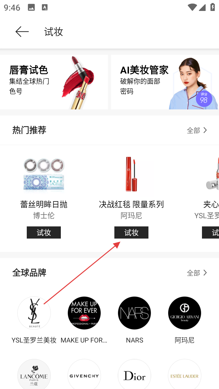 2、在试妆页面的热门推荐中,找到想要试妆的产品,点击产品下方的试妆按钮。
