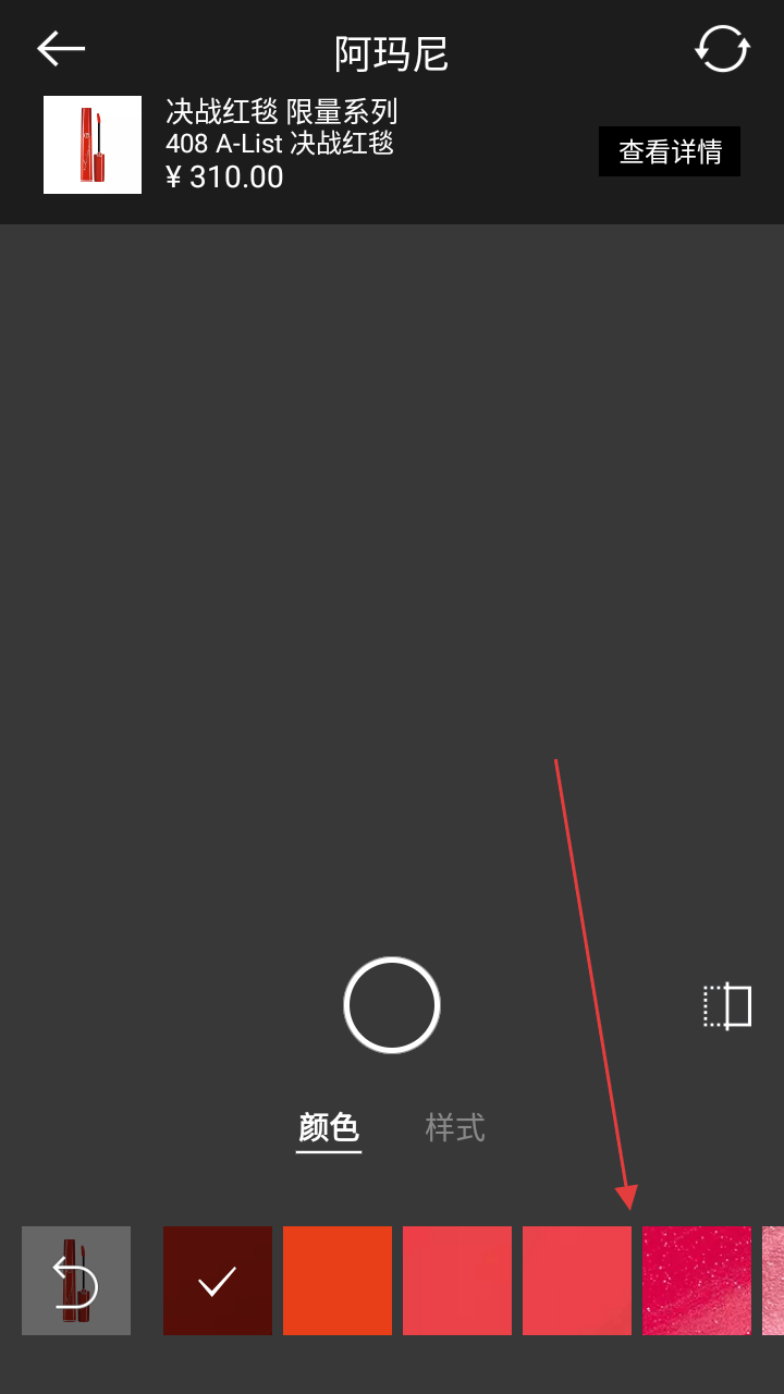 3、进入具体产品页面后,滑动下方色卡,选择心仪的颜色,即可在脸上模拟试妆效果。