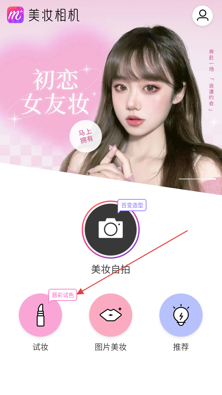 1、打开美妆相机应用,在首页点击试妆图标,进入试妆功能板块。
