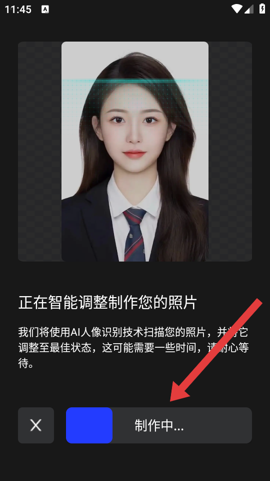 4、照片上传/拍摄后,等待系统智能调整制作您的照片,界面显示制作中...。