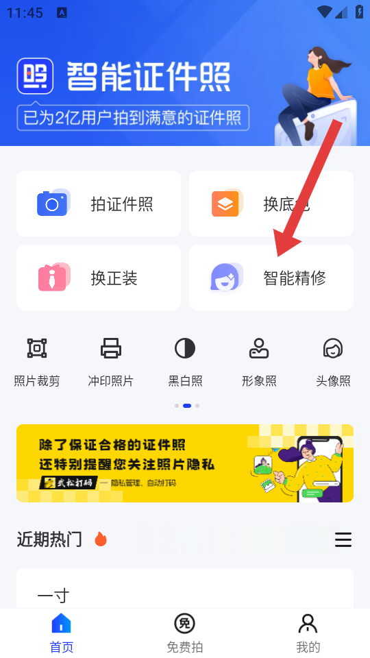1、在智能证件照首页,点击智能精修选项,进入一键气质精修的页面。