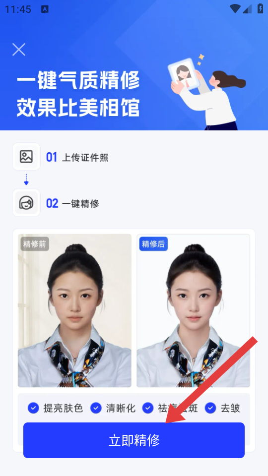2、在一键气质精修页面,点击立即精修的按钮,进入照片上传/拍摄界面。