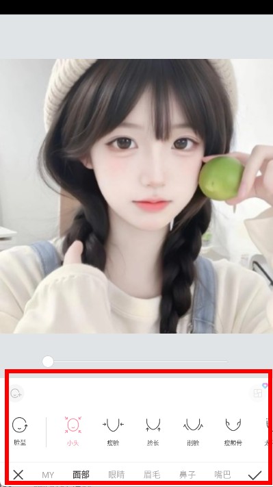 3、在照片编辑页面的面部选项中,可对脸型等进行调整。