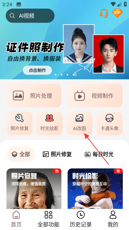 1、在照片时光机首页,点击AI改图按钮,进入AI改图页面。