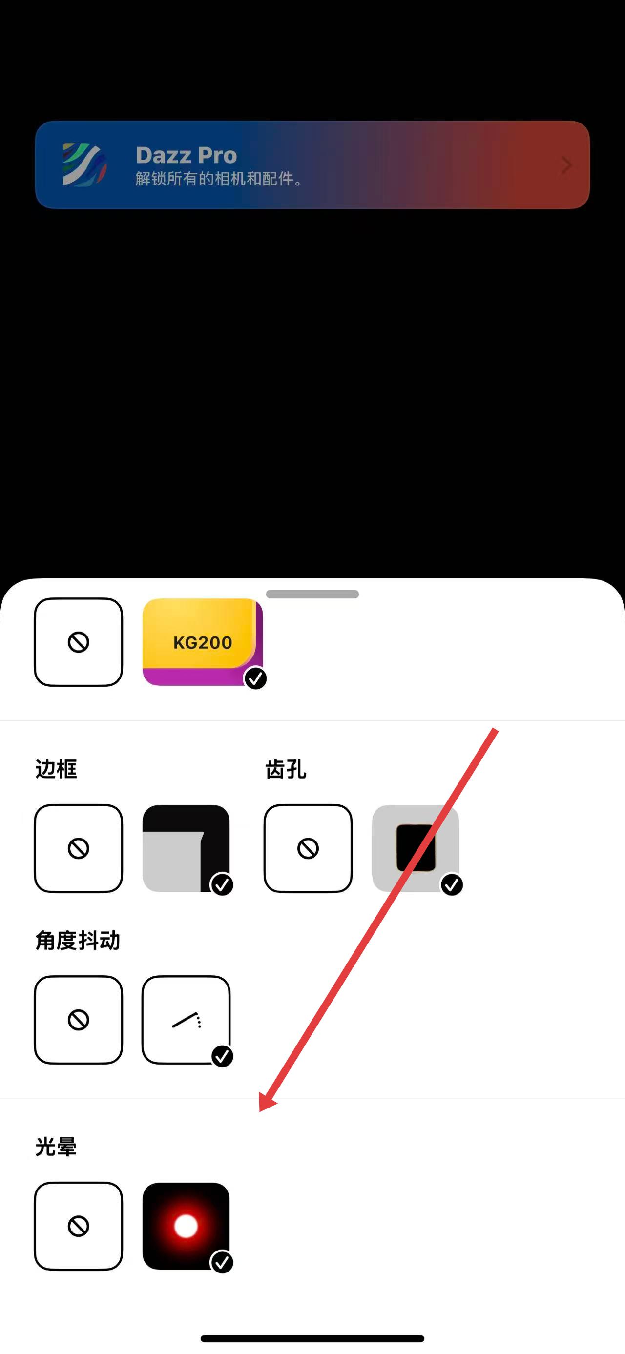 3、在滤镜和效果设置界面,可以选择边框、齿孔、角度抖动、光晕等多种效果进行设置,设置完成后返回拍摄使用滤镜效果。