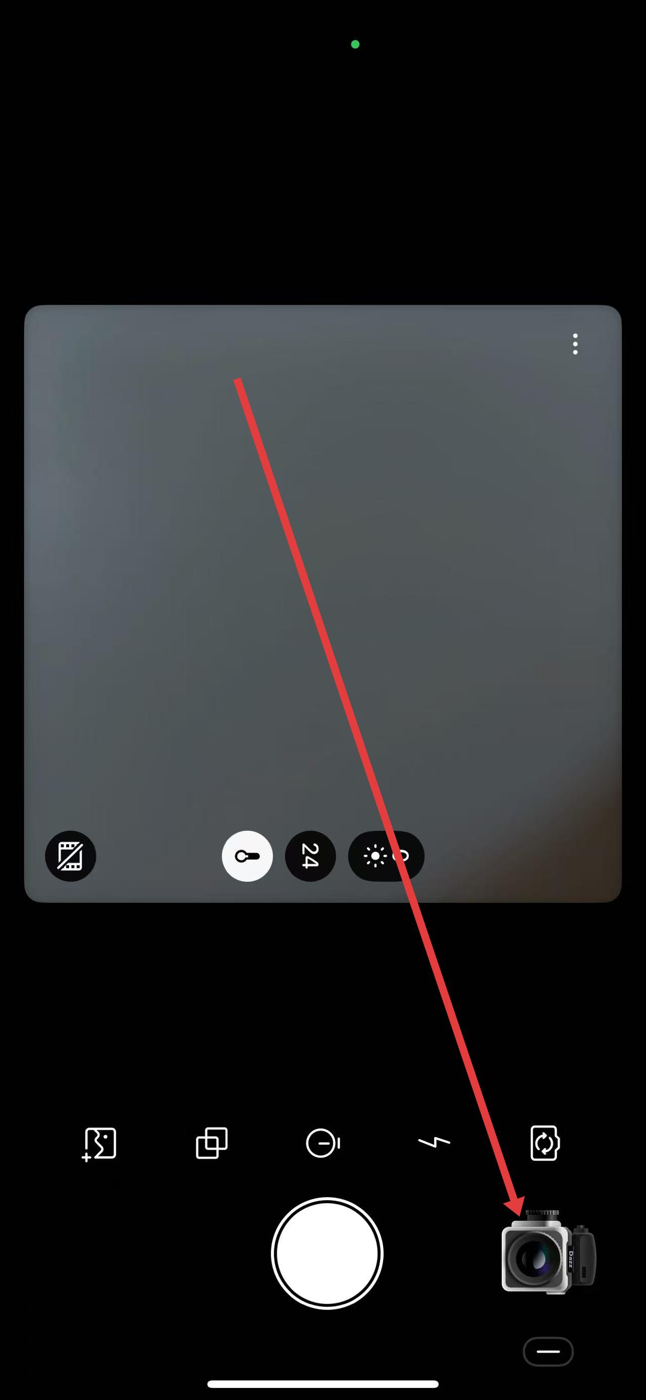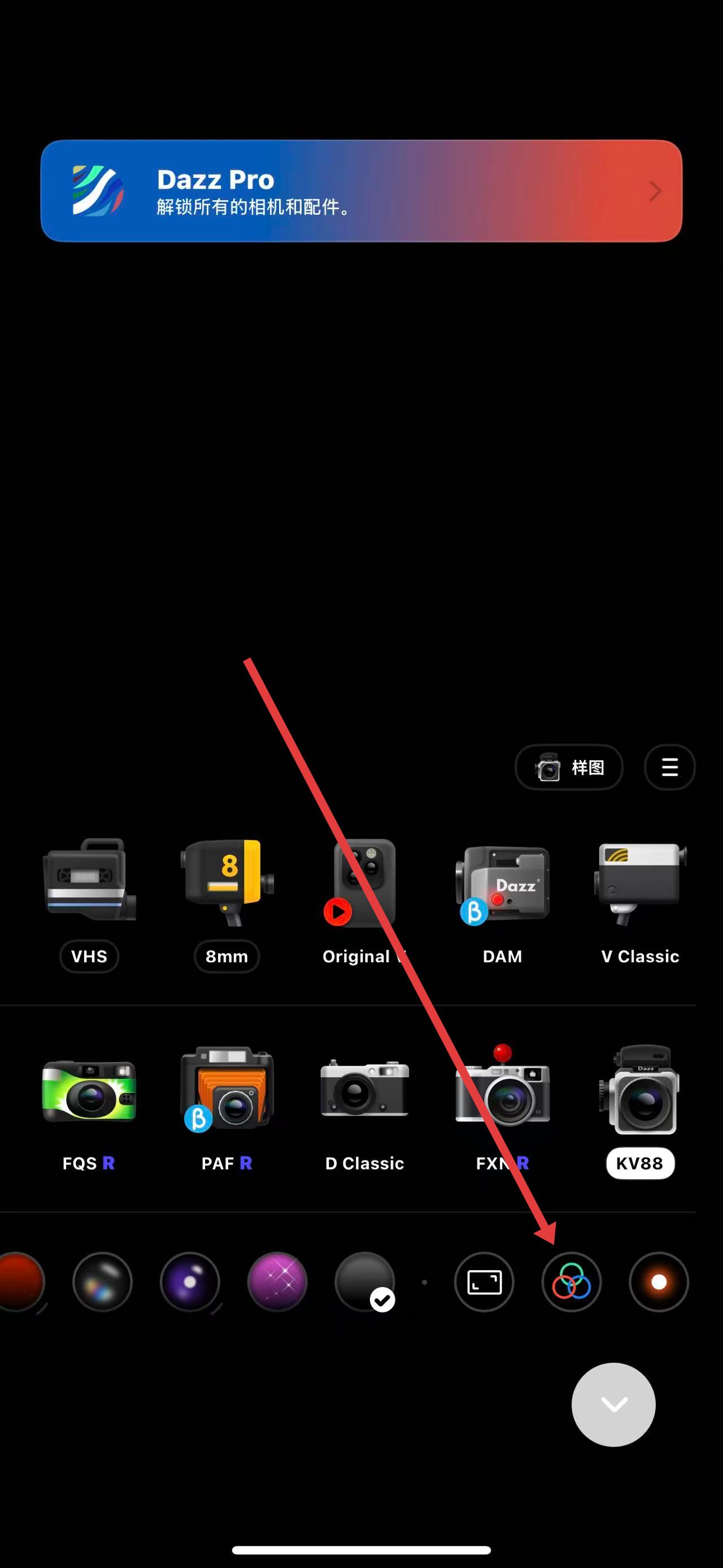 1、打开dazz相机APP,进入拍摄界面,点击拍摄按钮右侧的相机图标模拟相机样式,进入相机选择界面。