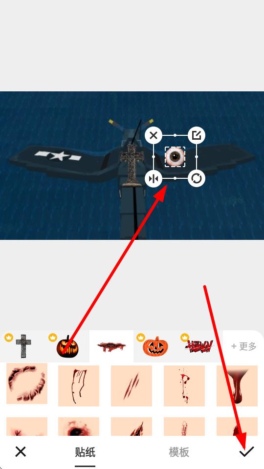 3、添加后通过双指缩放、单指拖动等操作,调整贴纸的大小、位置和角度,调整完毕后点击贴纸界面右下角的确认按钮,最后点击界面右上角的保存。