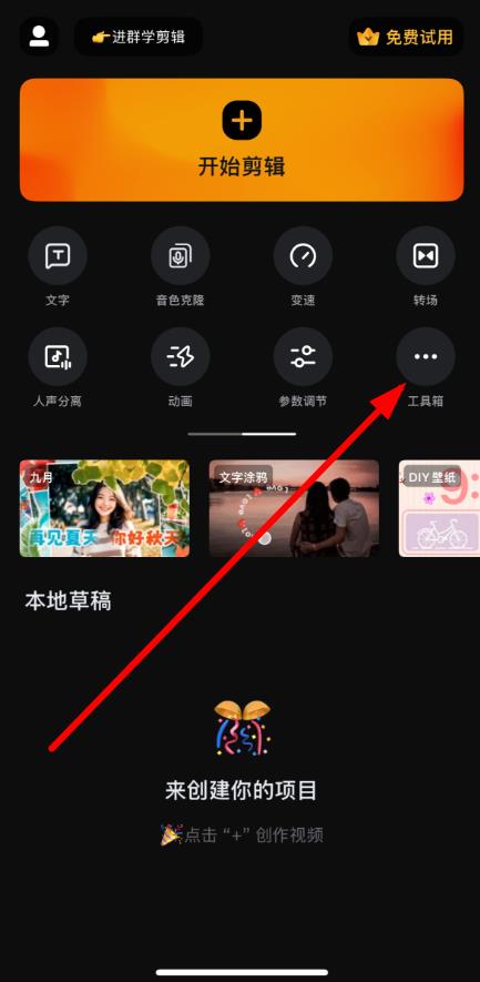 1、打开小影app进入主界面,点击界面右侧的工具箱图标。