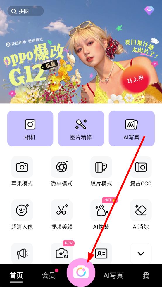 1、打开美颜相机APP,点击底部正中间类似相机带圆环的拍摄按钮,进入拍摄操作界面。