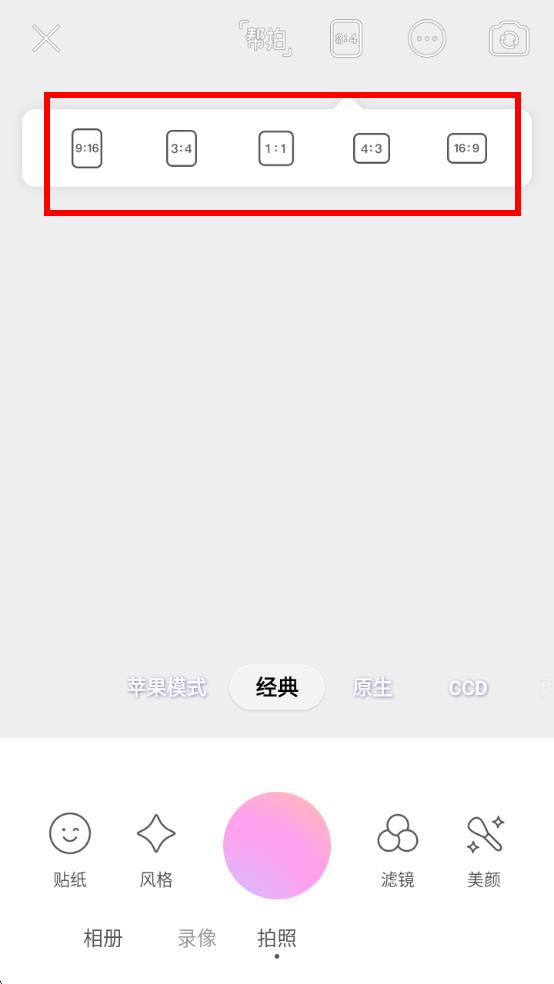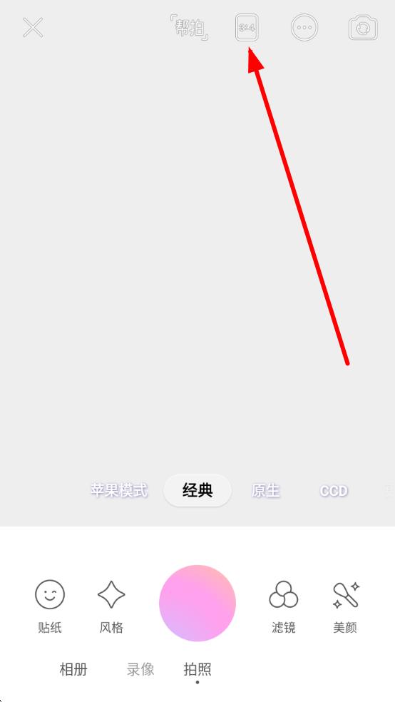 2、在拍摄界面上方,点击尺寸图标看起来像数字3:4的那个按钮,即可调出尺寸设置选项。