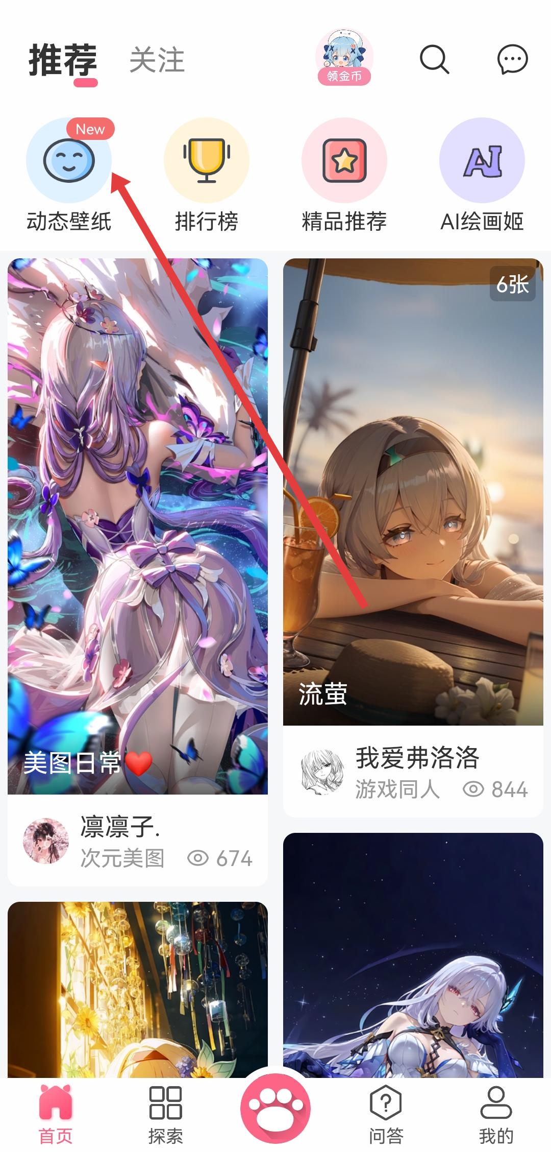 1、打开唔姆APP,在首页上方点击动态壁纸的选项,进入动态壁纸列表页面。