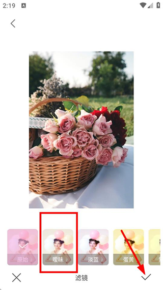 4、在滤镜选择页面,选择滤镜后,点击下方箭头即可应用该滤镜。