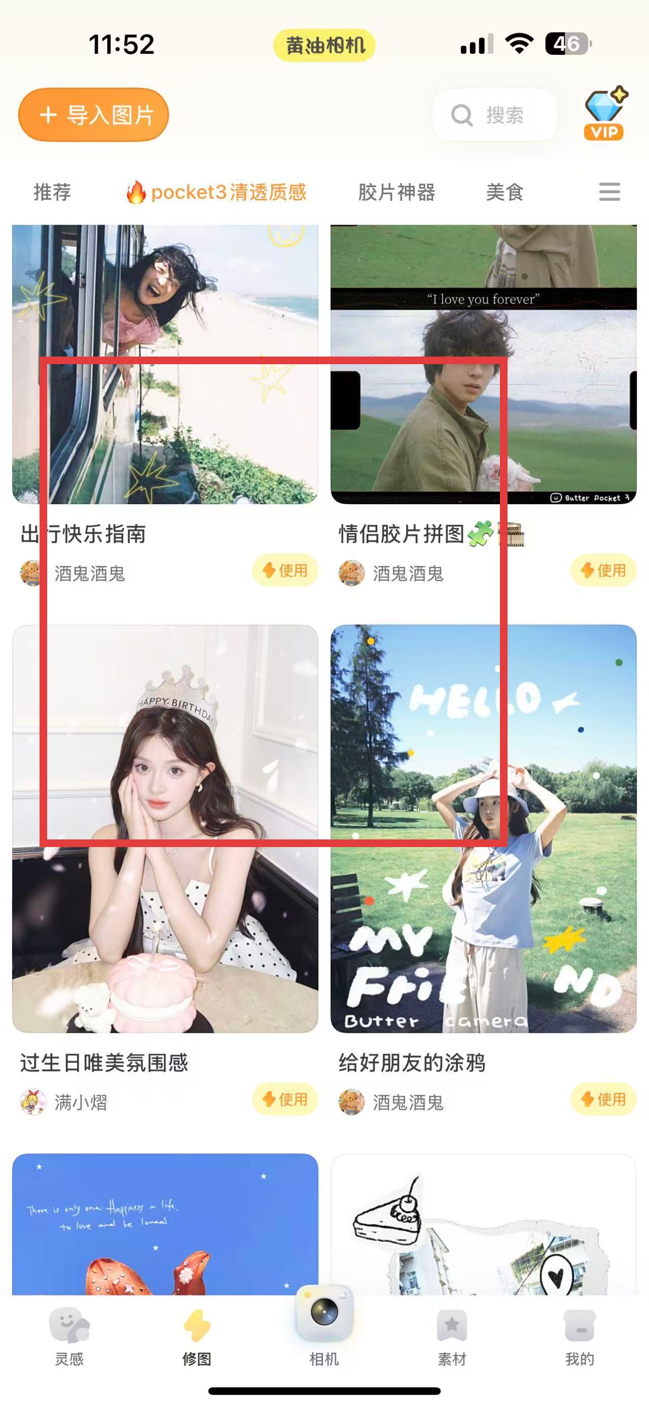 2、在修图界面中,点击导入图片上传需要p的照片,或者从推荐的模板中选择喜欢的模板,如出行快乐指南、情侣胶片拼图等。