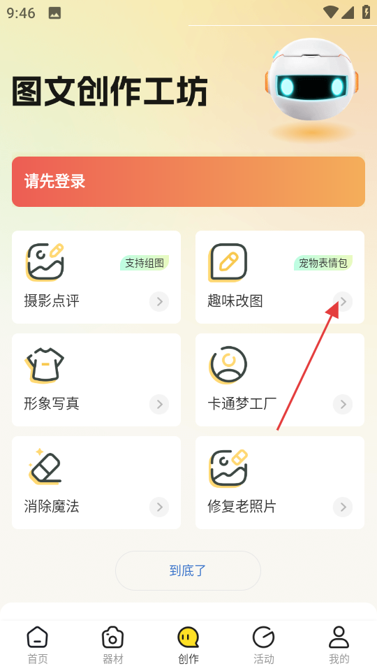 2、在图文创作工坊页面,点击趣味改图,进入趣味改图页面。