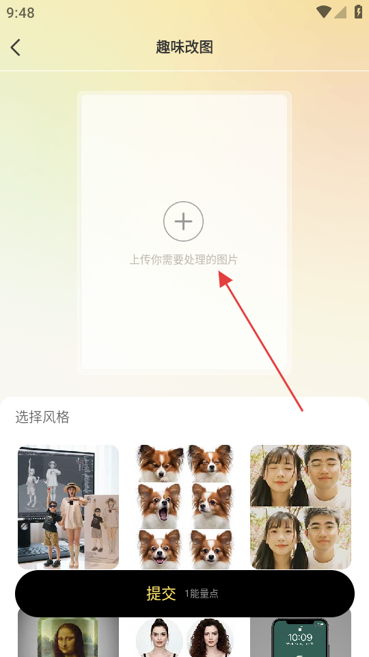 3、在趣味改图页面,点击上传你需要处理的图片,进入相机胶卷选择页面。
