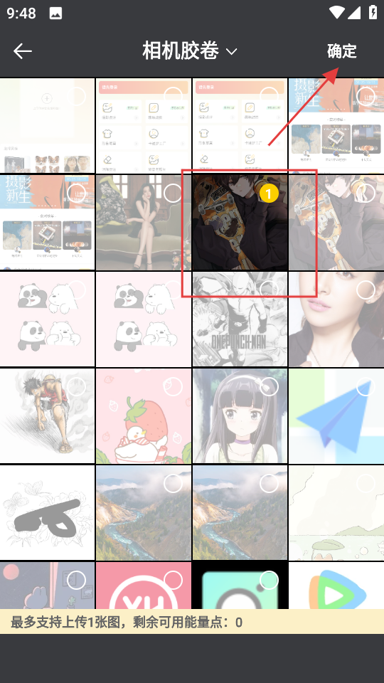 4、在相机胶卷选择页面,选择要改图的图片,点击确定,即可进行趣味改图操作。