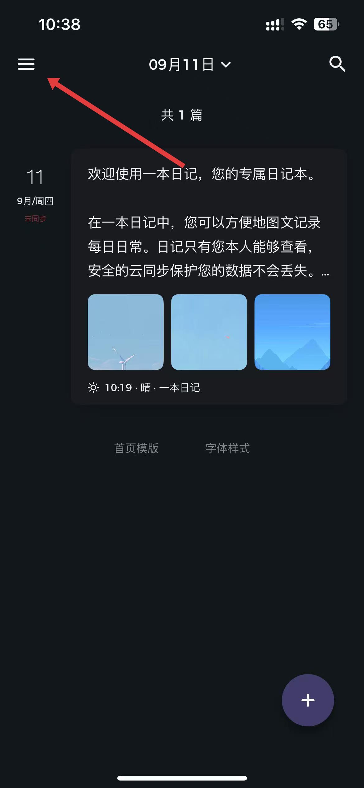 1、打开一本日记app,点击界面左上角三条横线状的菜单图标,展开隐藏菜单。