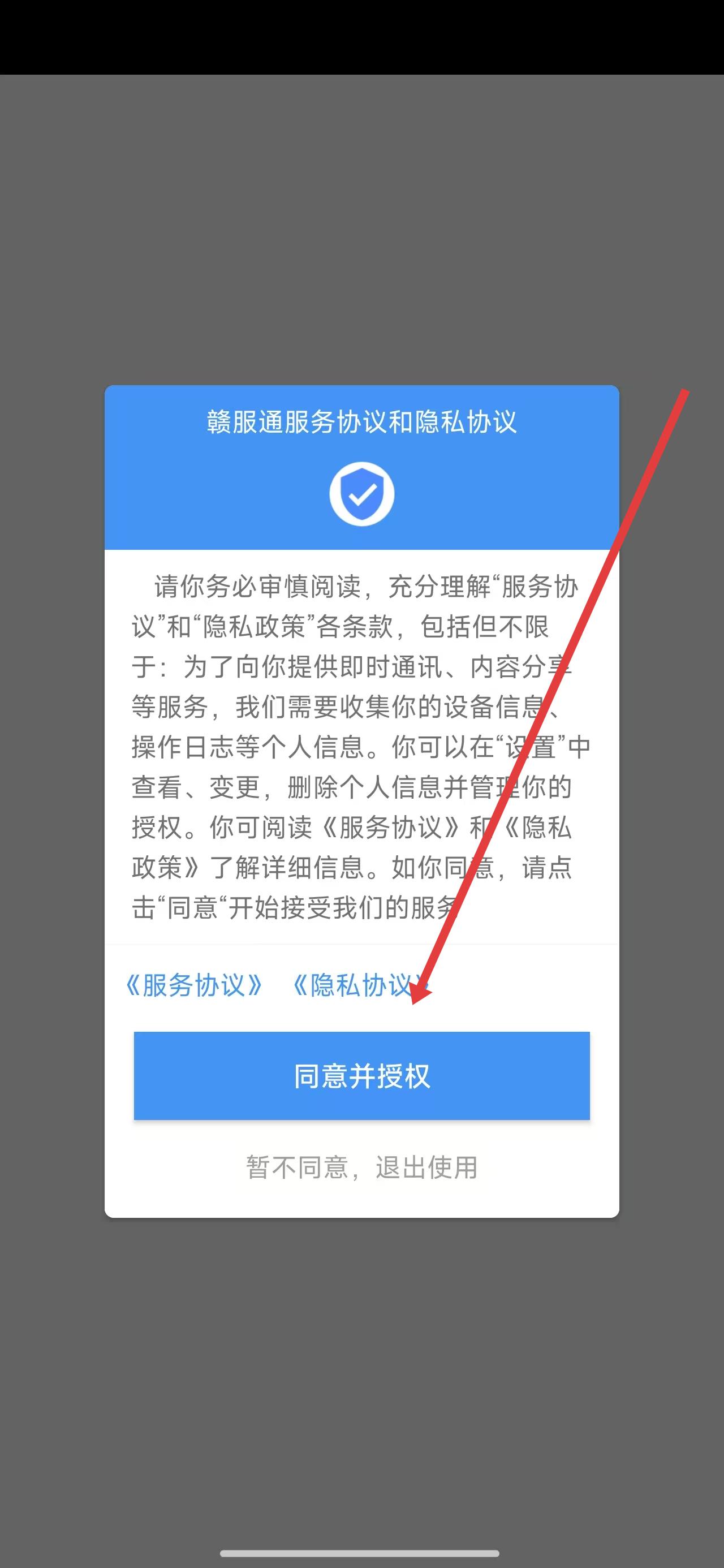 1、点开赣服通App后,通过点击弹窗中的同意按钮,进入使用。
