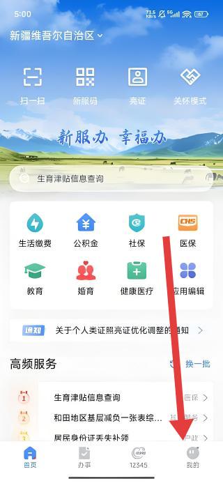 2、在新服办APP首页,可以按照箭头指引方向点击底部我的图标,进入个人中心页面。
