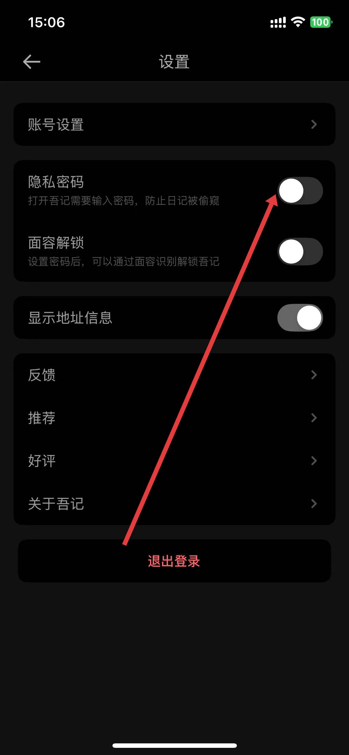 3、在设置界面里,找到隐私密码选项,点击其右侧的开关按钮将其开启。