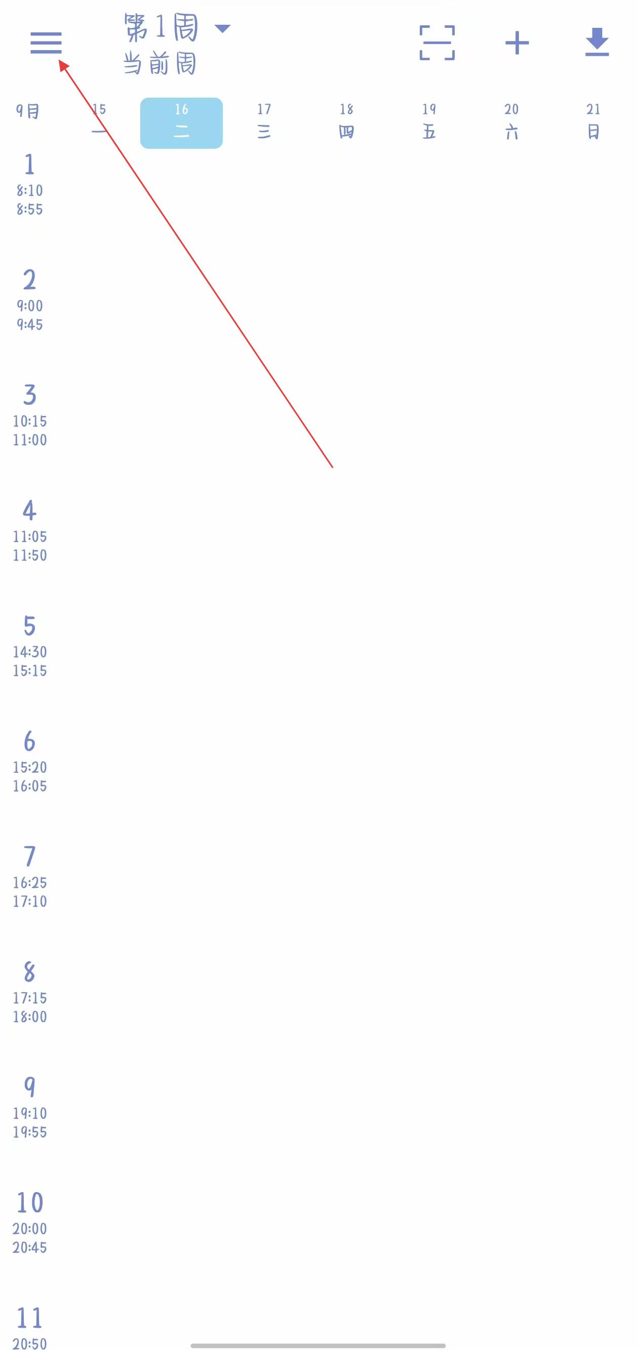 1、打开Simple课程表,点击界面左上角三条横线样式的菜单按钮,展开侧边栏菜单。