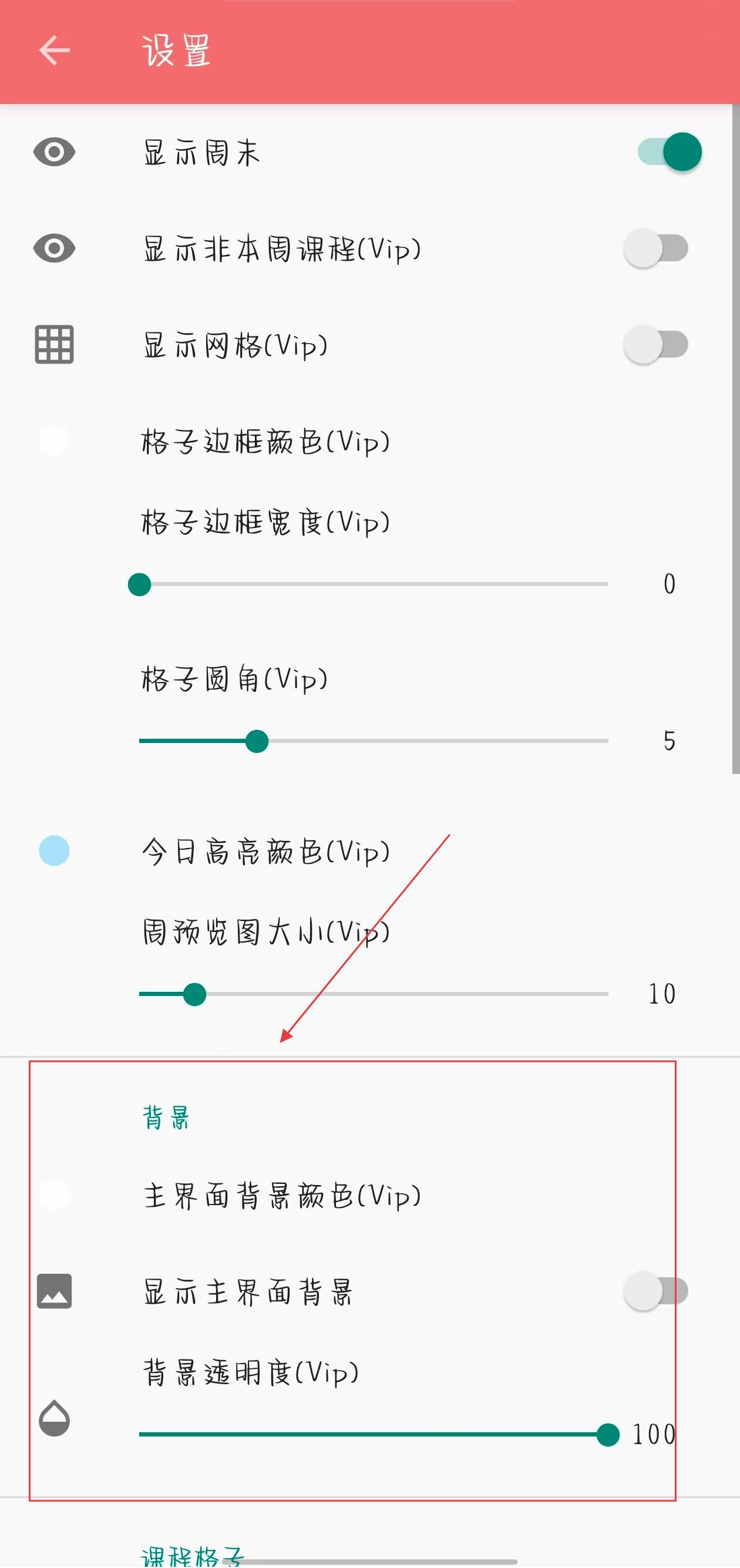 4、在课程显示设置中,找到背景相关设置项,可根据需求调整背景颜色、透明度等参数,完成背景设置。