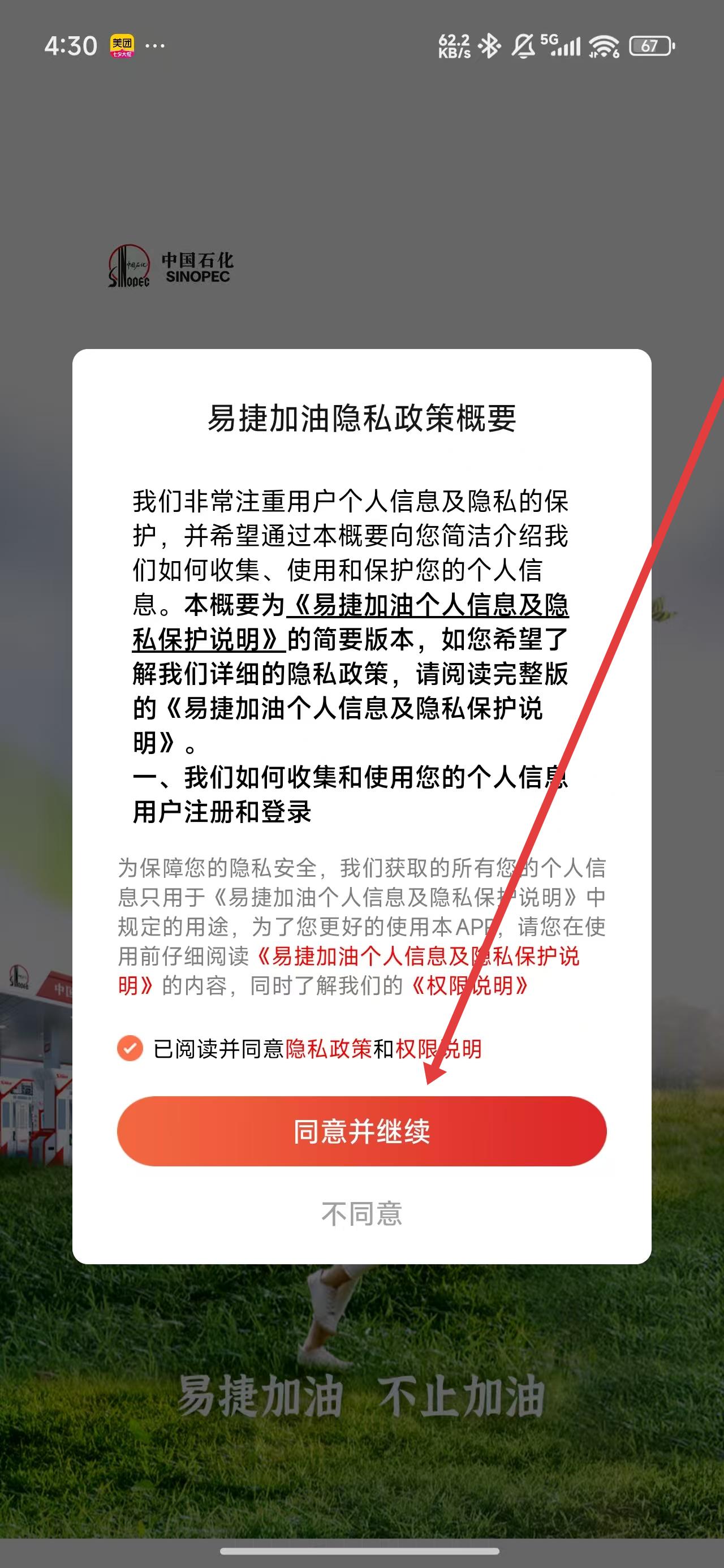 1、打开中国石化app,点击弹窗中的同意并继续按钮,开始进入使用。