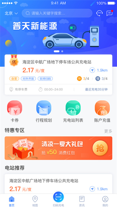 1.查询:通过搜索地名,可以实时查询附近充电桩。
