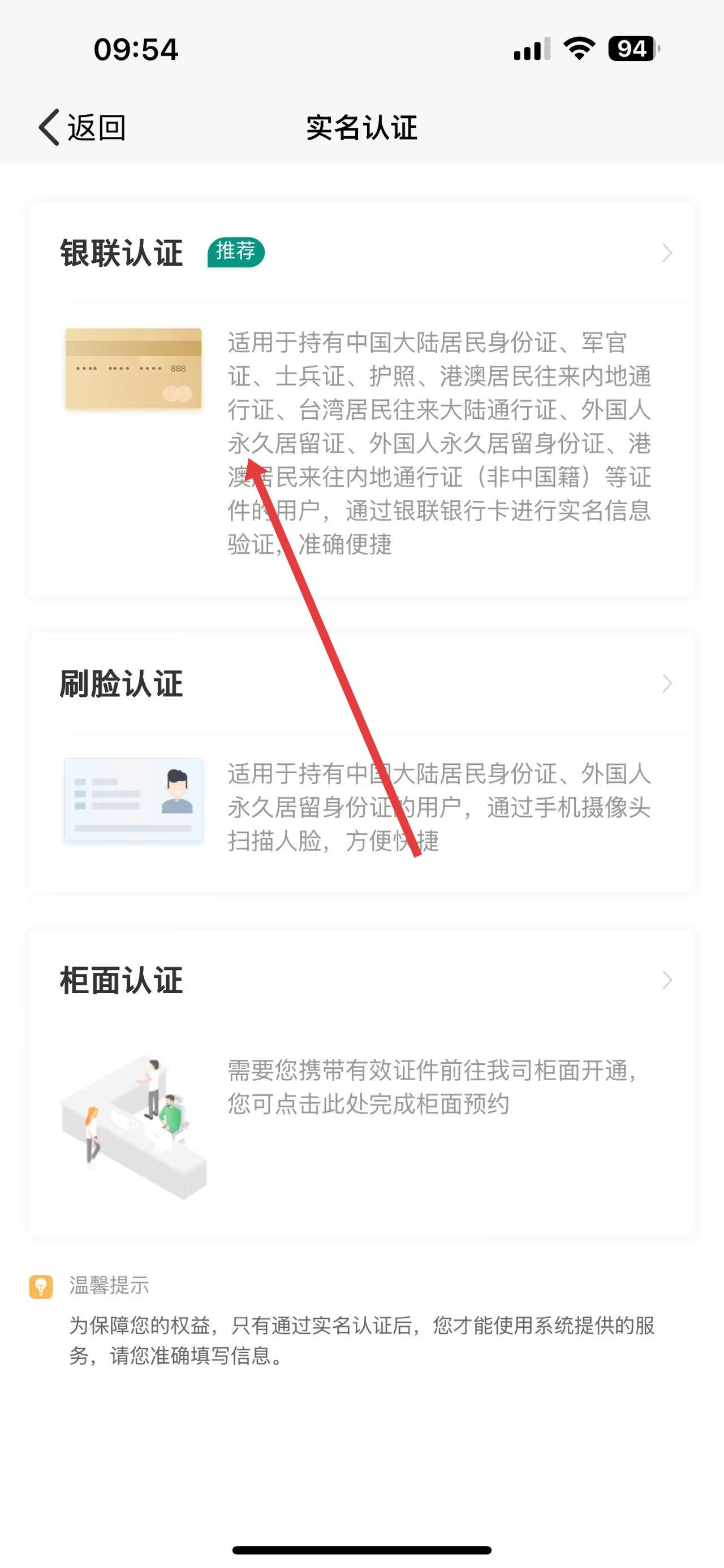 3、进入实名认证页面,您可以看到银联认证、刷脸认证、柜面认证三种认证方式,若要绑定银行卡,推荐选择银联认证,完成银行卡绑定及实名认证操作。