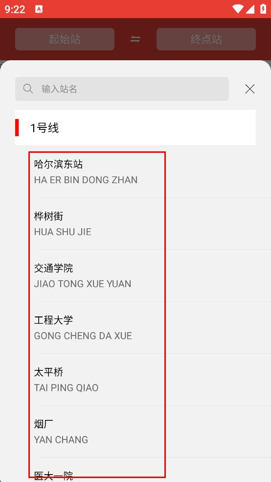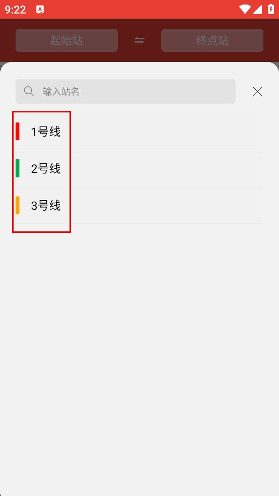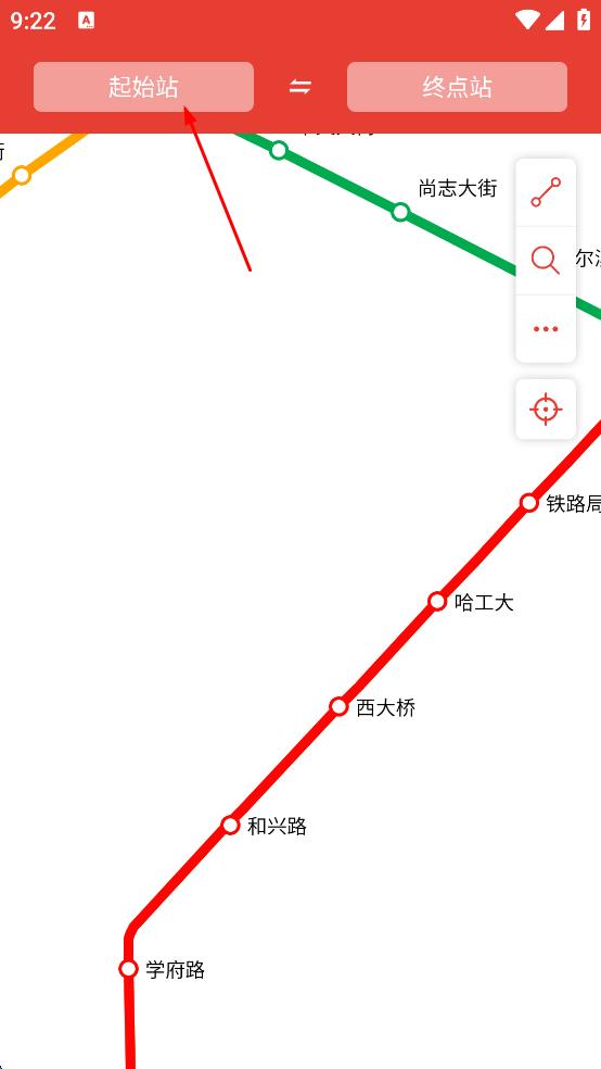 1、打开地铁出行软件,进入主界面后,点击“起始站”按钮,弹出线路选择页面。