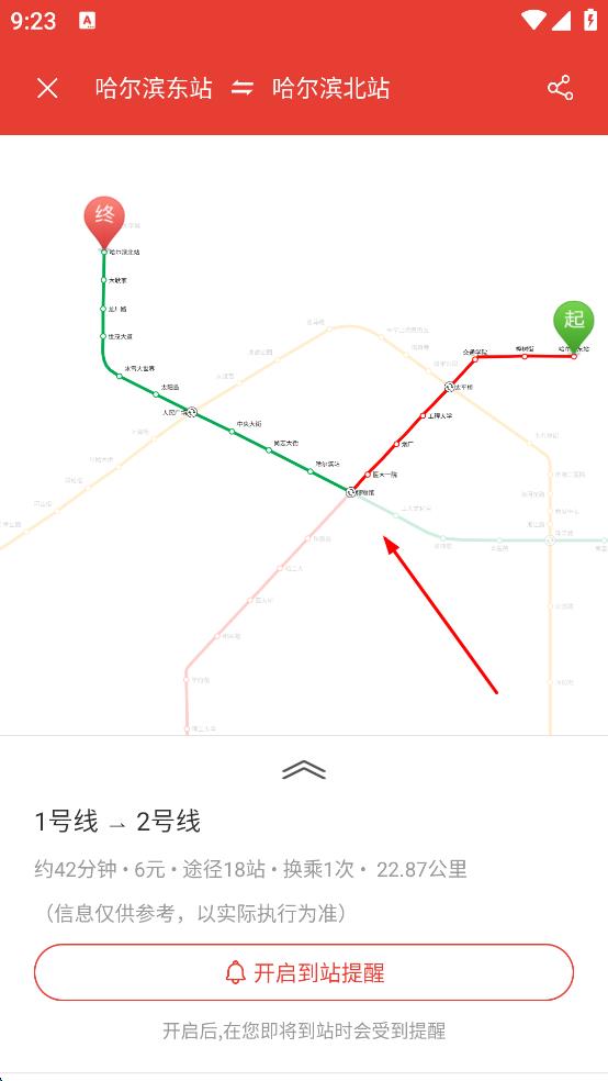 4、设置好后,软件会自动生成行程路线,展示出所需时间、票价、途径站点数、换乘次数以及行程公里数等信息,还可点击“开启到站提醒”,以便及时知晓到站信息。