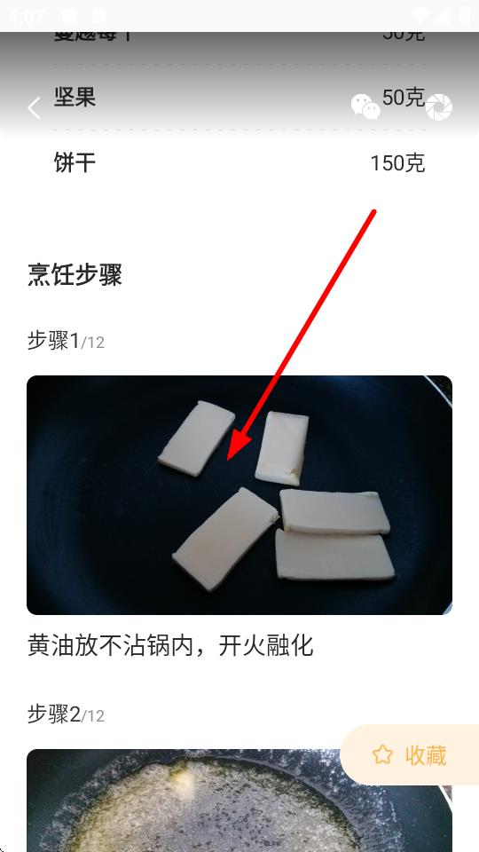 4、点击选中的甜点菜谱,进入详情页,按烹饪步骤操作,如先将黄油放入不沾锅内开火融化。
