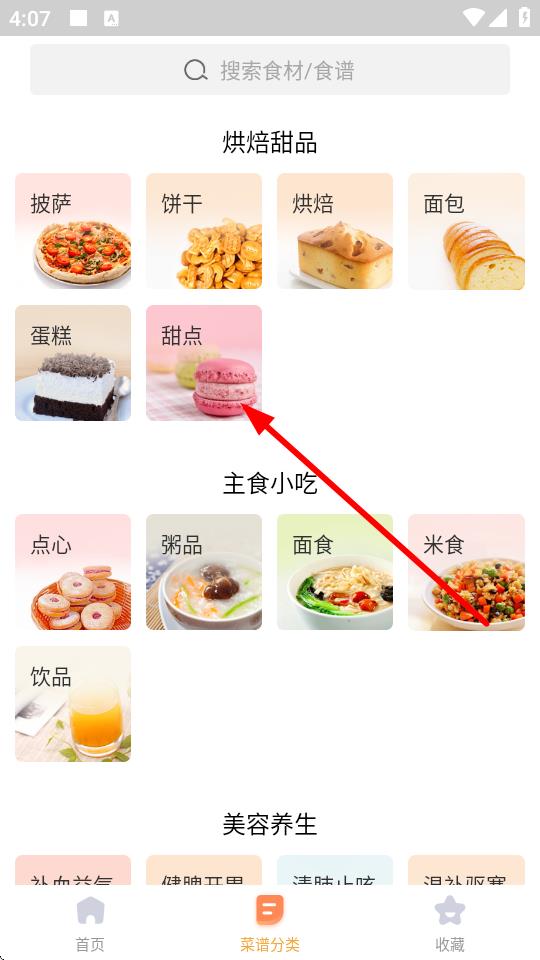 2、在菜谱分类页面,找到烘焙甜品板块,点击其中的甜点类别。