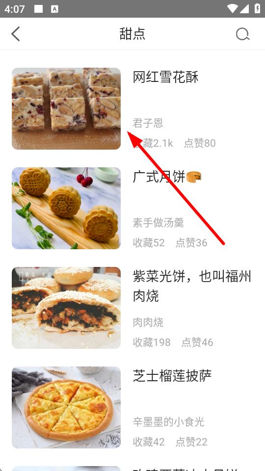3、进入甜点页面后,浏览各类甜点菜谱,比如选择网红雪花酥。