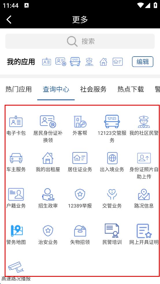 3、进入“更多”页面后,找到“查询中心”分类,在该分类下可看到众多业务选项,如电子卡包、居民身份证补换领等。