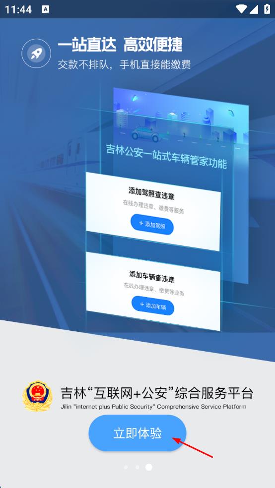 1、打开吉林公安APP,在弹出的用户服务协议与隐私政策页面,点击“同意并继续”,进入“一站直达 高效便捷”界面后,点击“立即体验”。