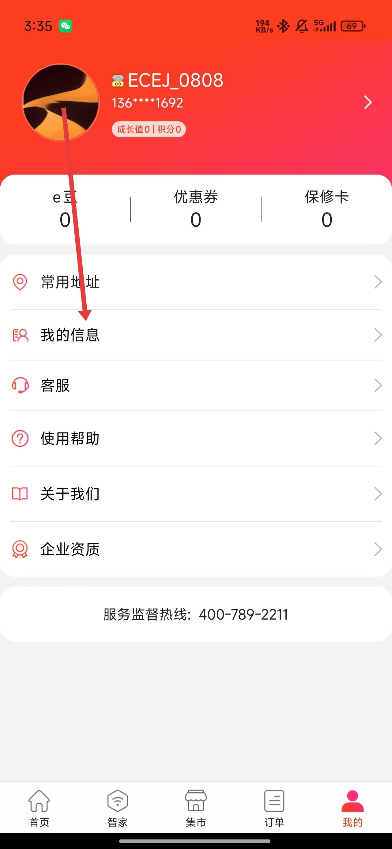 1、在e城e家我的主页中,点击我的信息选项可进入查看或更改信息。