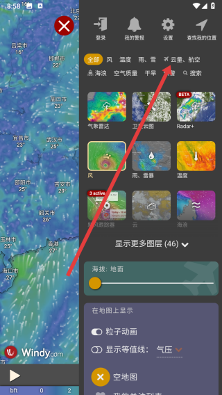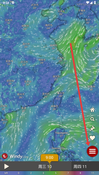 1、进入到windy应用中后,可以点击右侧图标按钮展开侧边栏查看更多功能。