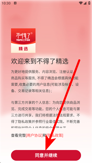 1、打开不得了精选,点击同意并继续,同意用户协议和隐私政策。