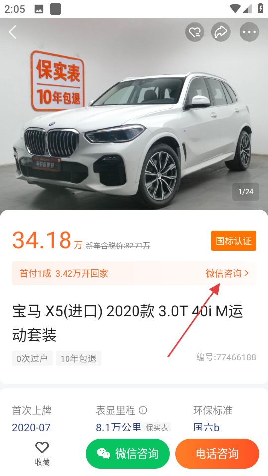 3、在车辆详情页面,点击微信咨询,进入登录页面。