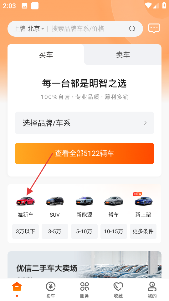 1、在二手车应用首页,点击准新车,进入准新车列表页面。