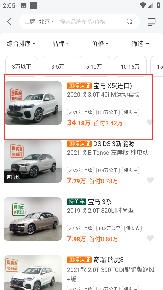 2、在准新车列表页面,选择宝马X5进口,进入该车详情页面。