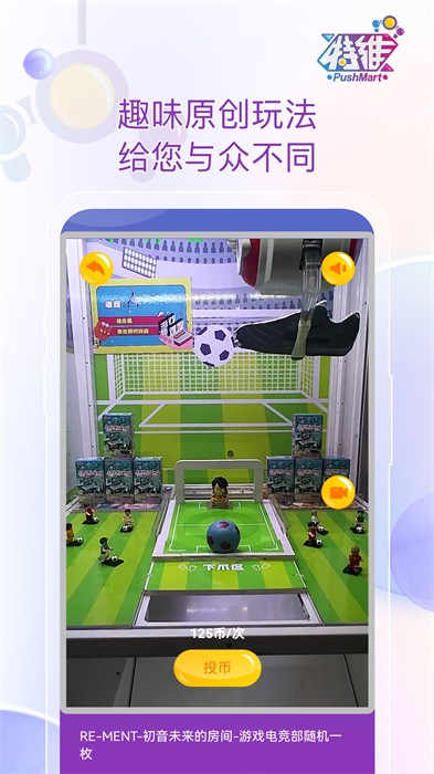 特维潮玩”Pushmart”是一款通过手机在线畅玩真实游乐场里各种娱乐机台的软件。以礼品机为主,让玩家在嗨玩的同时得到潮玩礼品。礼品一件包邮到家,软件对接第三方集市,玩家可以轻松交易或置换礼品。